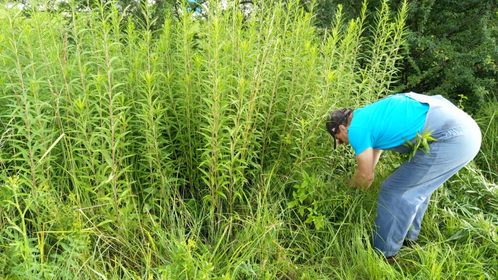 Mechanische Bekämpfung (Ausreissen): Pflanzen 1-2x/Jahr vor der Blüte ausreissen (Mai und Juni), dabei das Rhi-