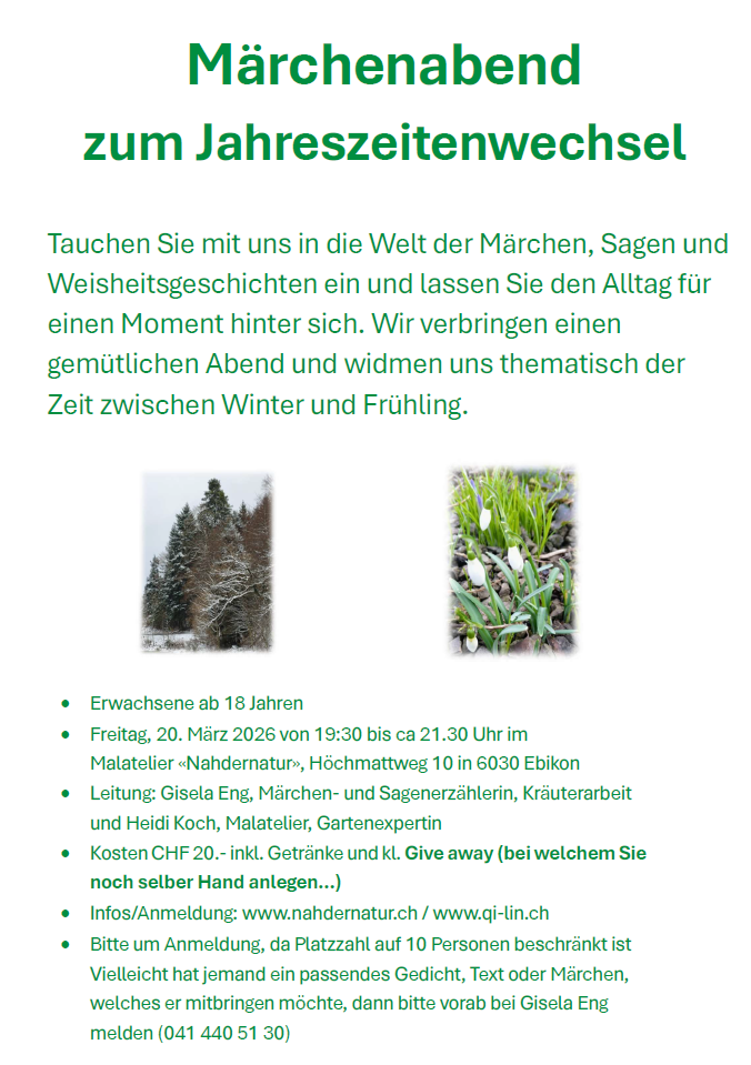 Hier findest du geplante Veranstaltungen im Atelier Nahdernatur, z. B. einmalig stattfindende wie die Märchenstunde, oder Kreativkurse wie z. B. Basteln mit Papier, aber auch bei genügend Interesse regelmässige Treffs.